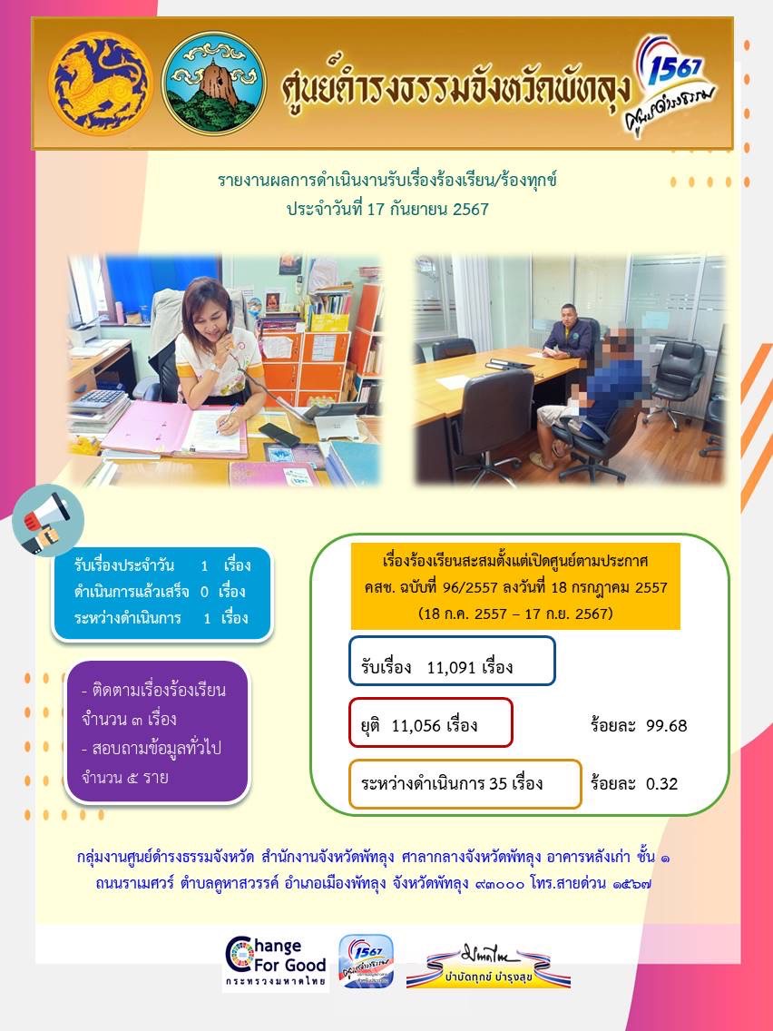 สถิติรับเรื่องร้องเรียน/ร้องทุกข์ วันที่ 17 กันยายน 2567