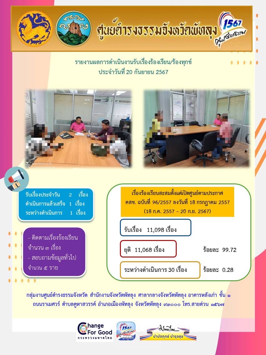 สถิติรับเรื่องร้องเรียน/ร้องทุกข์ วันที่ 20 กันยายน 2567