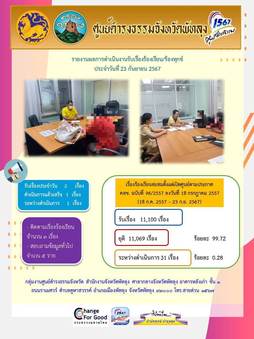 สถิติรับเรื่องร้องเรียน/ร้องทุกข์ วันที่ 23 กันยายน 2567