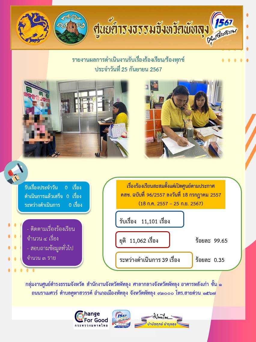 สถิติรับเรื่องร้องเรียน/ร้องทุกข์ วันที่ 25 กันยายน 2567