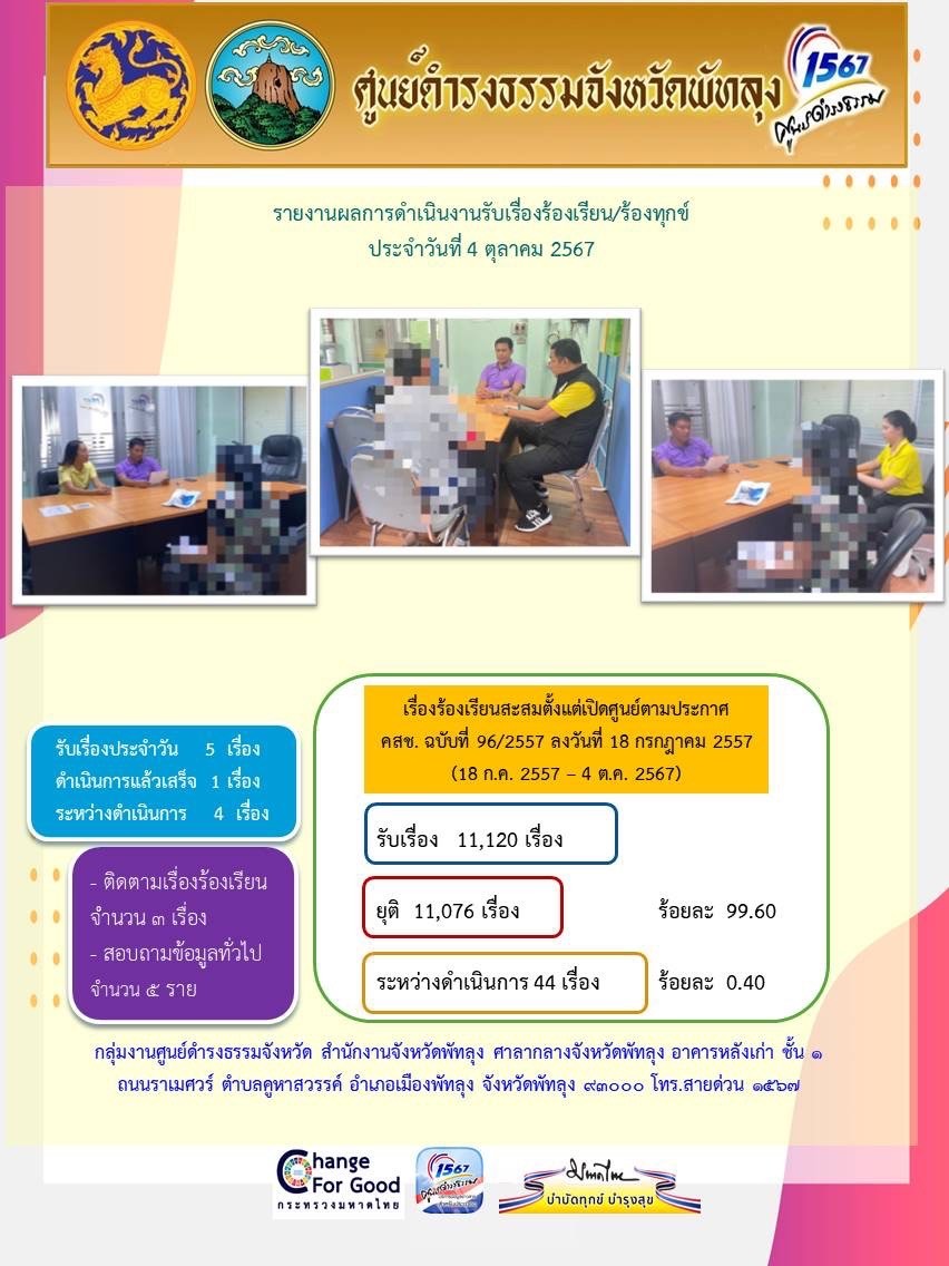 สถิติรับเรื่องร้องเรียน/ร้องทุกข์ วันที่ 4 ตุลาคม 2567