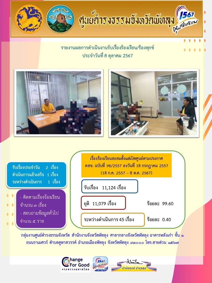 สถิติรับเรื่องร้องเรียน/ร้องทุกข์ วันที่ 8 ตุลาคม 2567