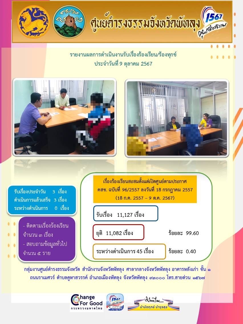 สถิติรับเรื่องร้องเรียน/ร้องทุกข์ วันที่ 9 ตุลาคม 2567