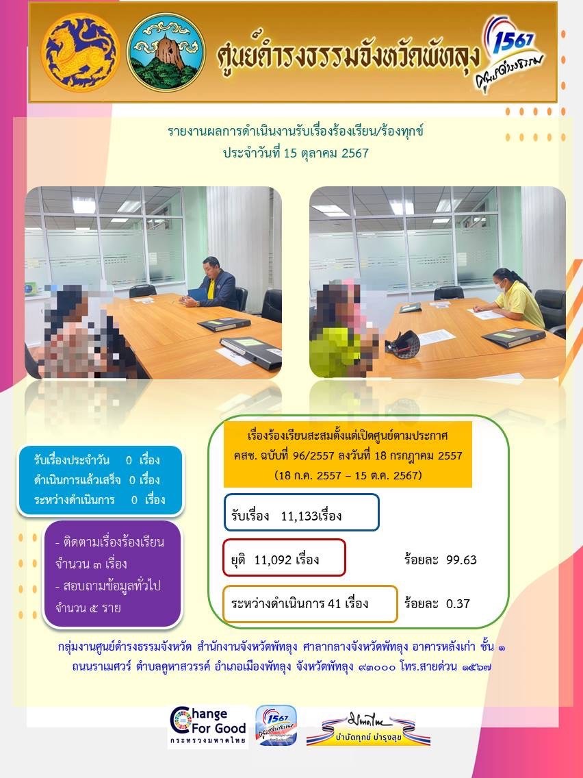 สถิติรับเรื่องร้องเรียน/ร้องทุกข์ วันที่ 15 ตุลาคม 2567