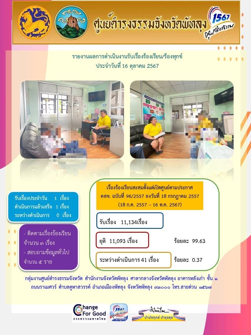 สถิติรับเรื่องร้องเรียน/ร้องทุกข์ วันที่ 16 ตุลาคม 2567