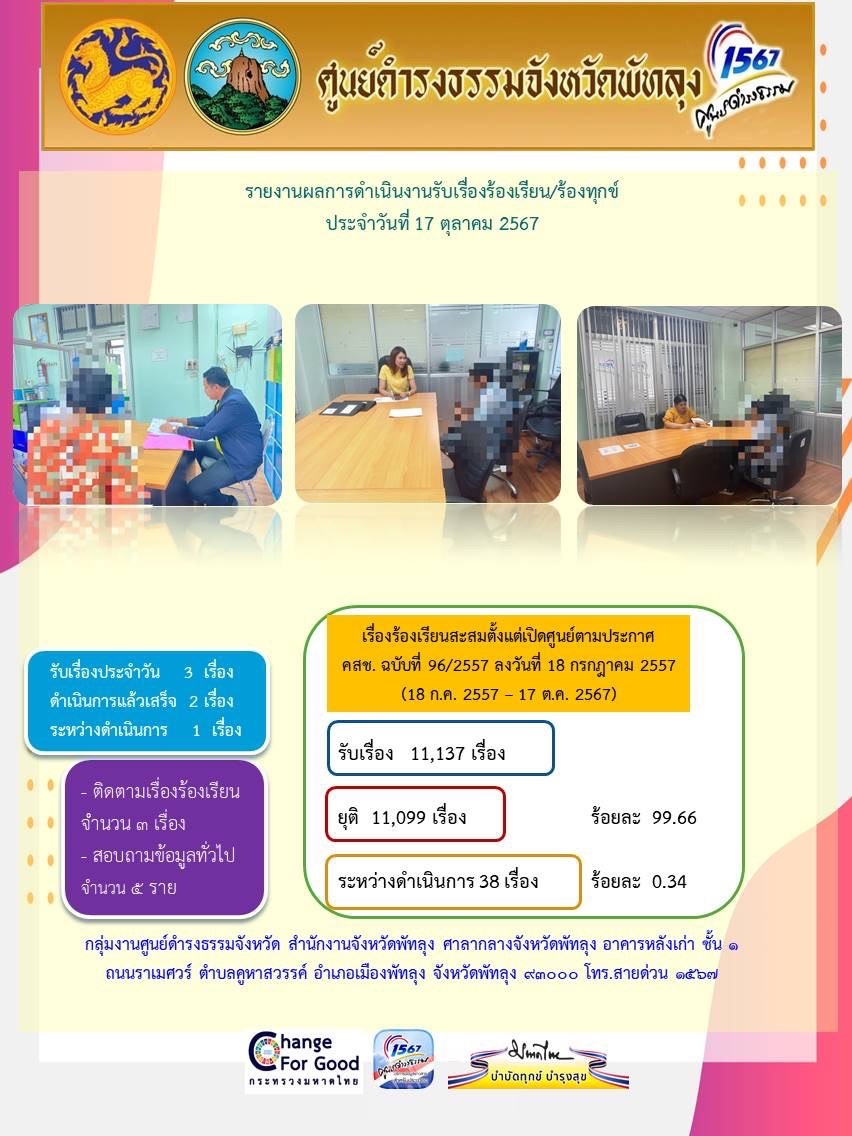 สถิติรับเรื่องร้องเรียน/ร้องทุกข์ วันที่ 17 ตุลาคม 2567