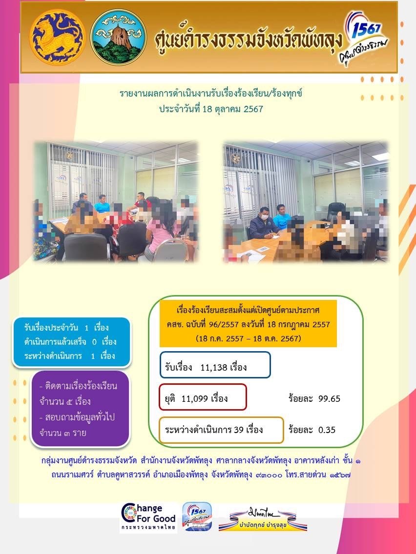 สถิติรับเรื่องร้องเรียน/ร้องทุกข์ วันที่ 18 ตุลาคม 2567