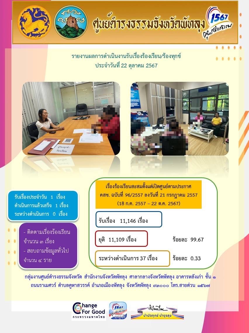สถิติรับเรื่องร้องเรียน/ร้องทุกข์ วันที่ 22 ตุลาคม 2567