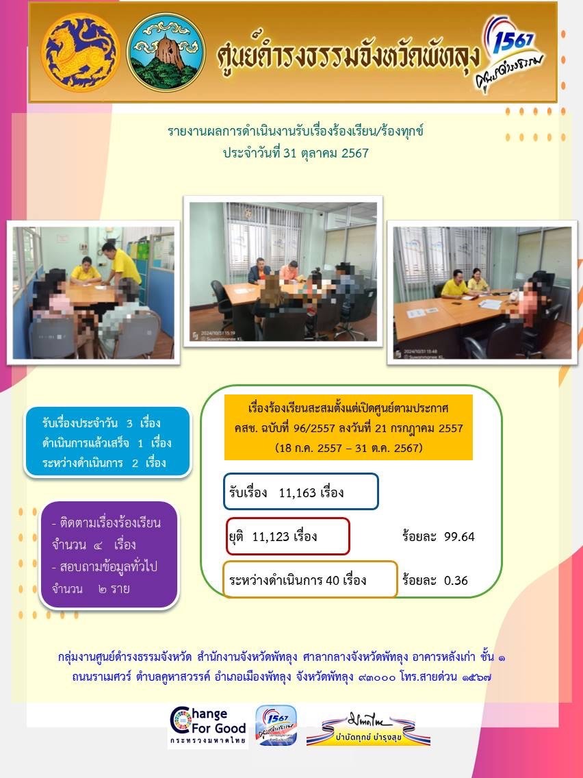 สถิติรับเรื่องร้องเรียน/ร้องทุกข์ วันที่ 31 ตุลาคม 2567