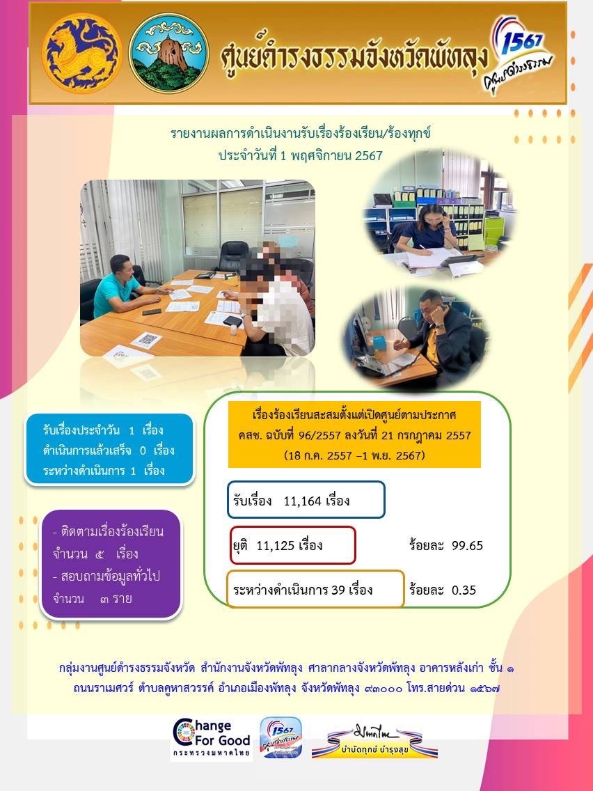 สถิติรับเรื่องร้องเรียน/ร้องทุกข์ วันที่ 1 พฤศจิกายน 2567