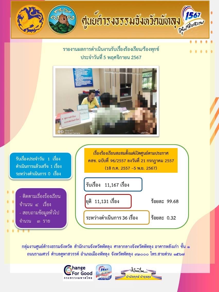 สถิติรับเรื่องร้องเรียน/ร้องทุกข์ วันที่ 5 พฤศจิกายน 2567