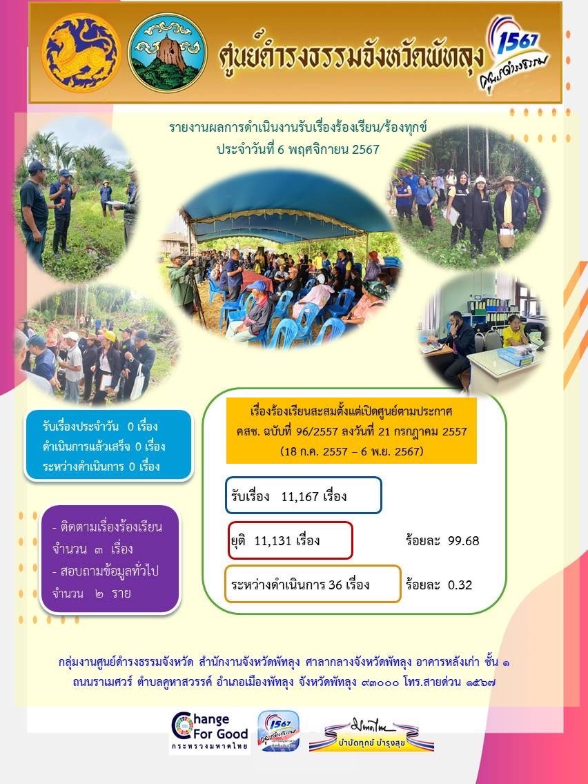 สถิติรับเรื่องร้องเรียน/ร้องทุกข์ วันที่ 6 พฤศจิกายน 2567