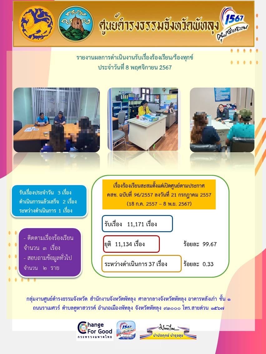 สถิติรับเรื่องร้องเรียน/ร้องทุกข์ วันที่ 8 พฤศจิกายน 2567
