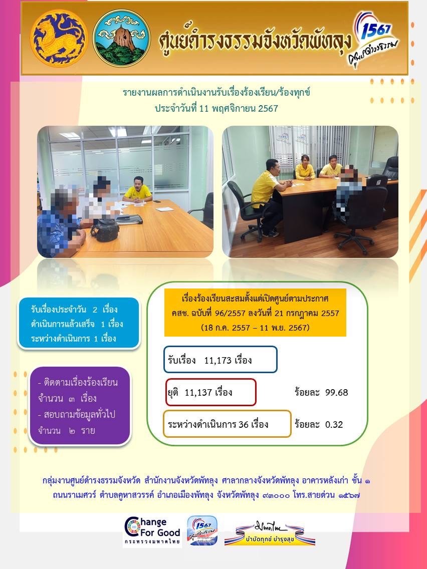สถิติรับเรื่องร้องเรียน/ร้องทุกข์ วันที่ 11 พฤศจิกายน 2567