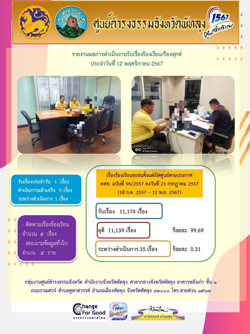 สถิติรับเรื่องร้องเรียน/ร้องทุกข์ วันที่ 12 พฤศจิกายน 2567