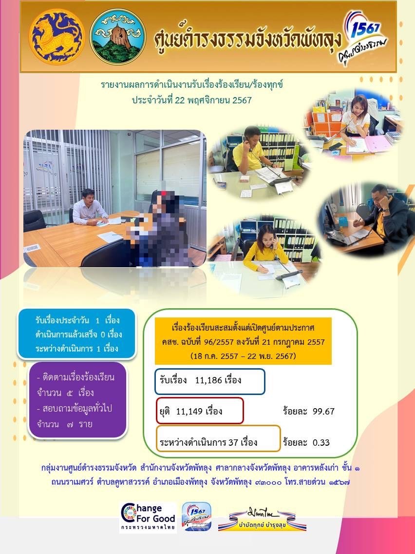 สถิติรับเรื่องร้องเรียน/ร้องทุกข์ วันที่ 22 พฤศจิกายน 2567