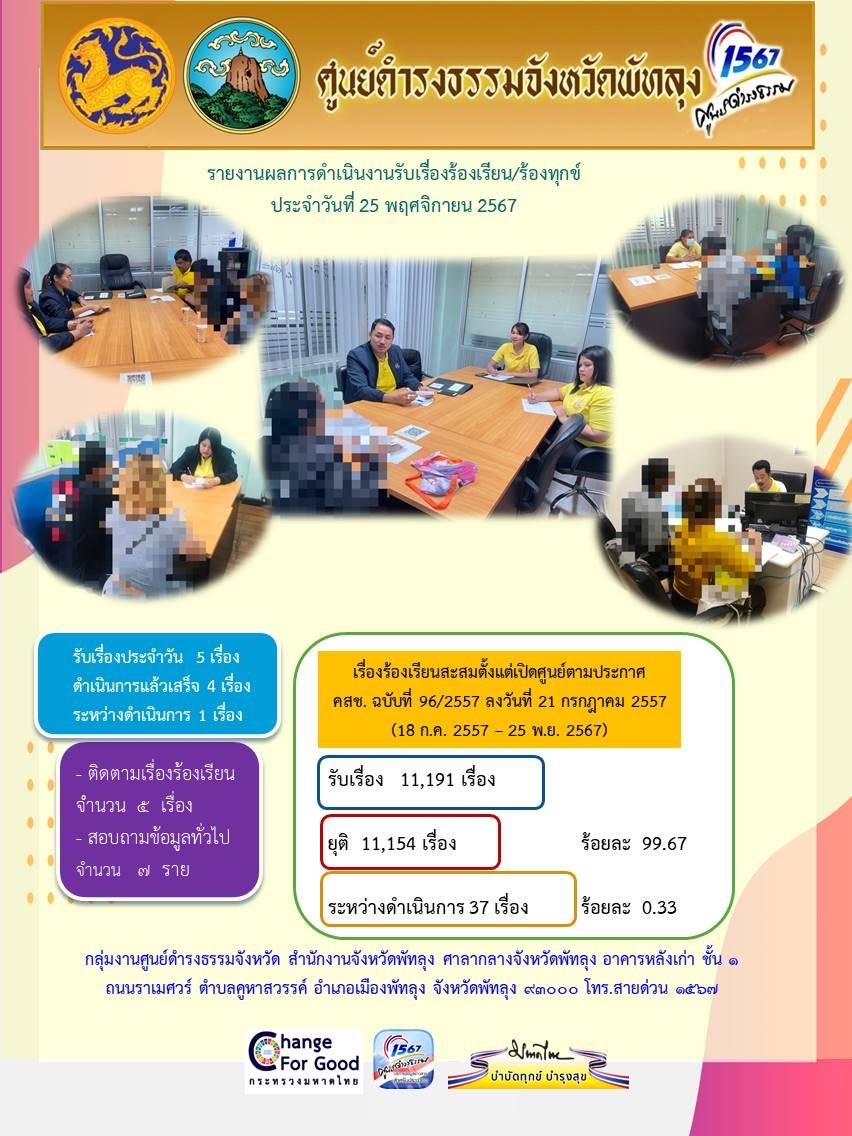 สถิติรับเรื่องร้องเรียน/ร้องทุกข์ วันที่ 25 พฤศจิกายน 2567