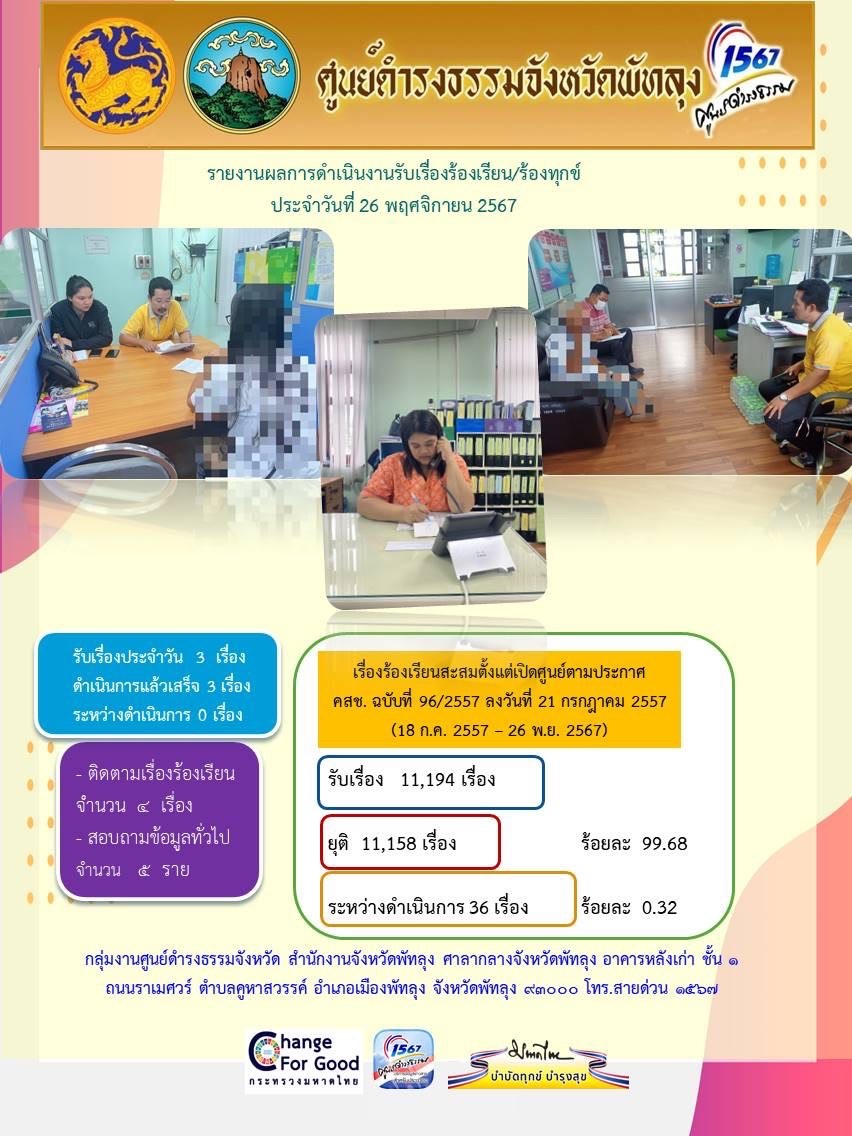 สถิติรับเรื่องร้องเรียน/ร้องทุกข์ วันที่ 26 พฤศจิกายน 2567
