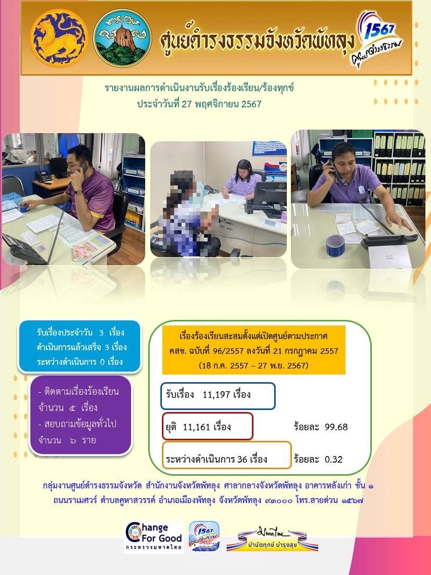 สถิติรับเรื่องร้องเรียน/ร้องทุกข์ วันที่ 27 พฤศจิกายน 2567