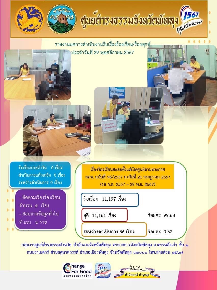 สถิติรับเรื่องร้องเรียน/ร้องทุกข์ วันที่ 29 พฤศจิกายน 2567