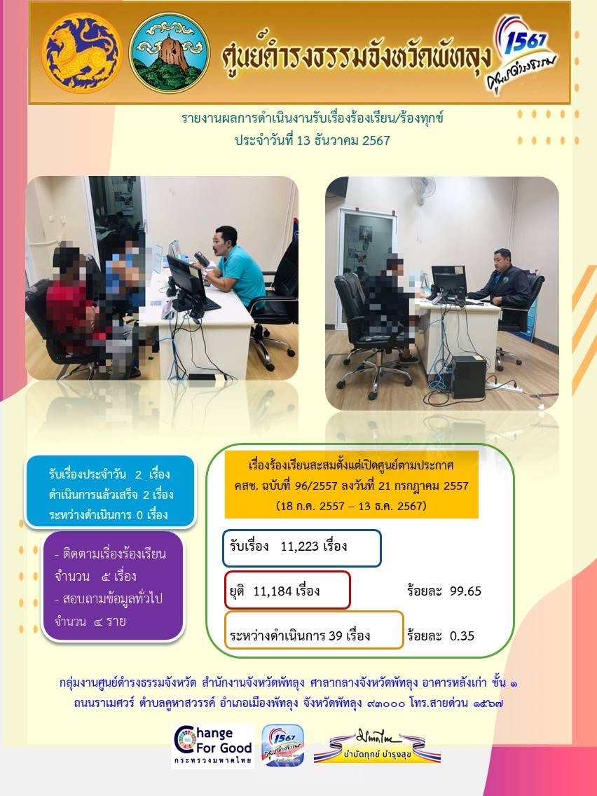 สถิติรับเรื่องร้องเรียน/ร้องทุกข์ วันที่ 13 ธันวาคม 2567