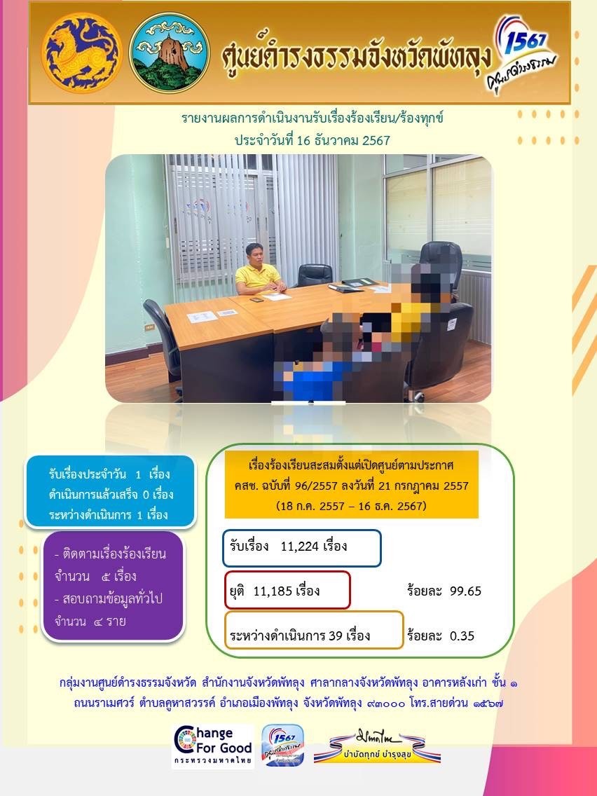 สถิติรับเรื่องร้องเรียน/ร้องทุกข์ วันที่ 16 ธันวาคม 2567