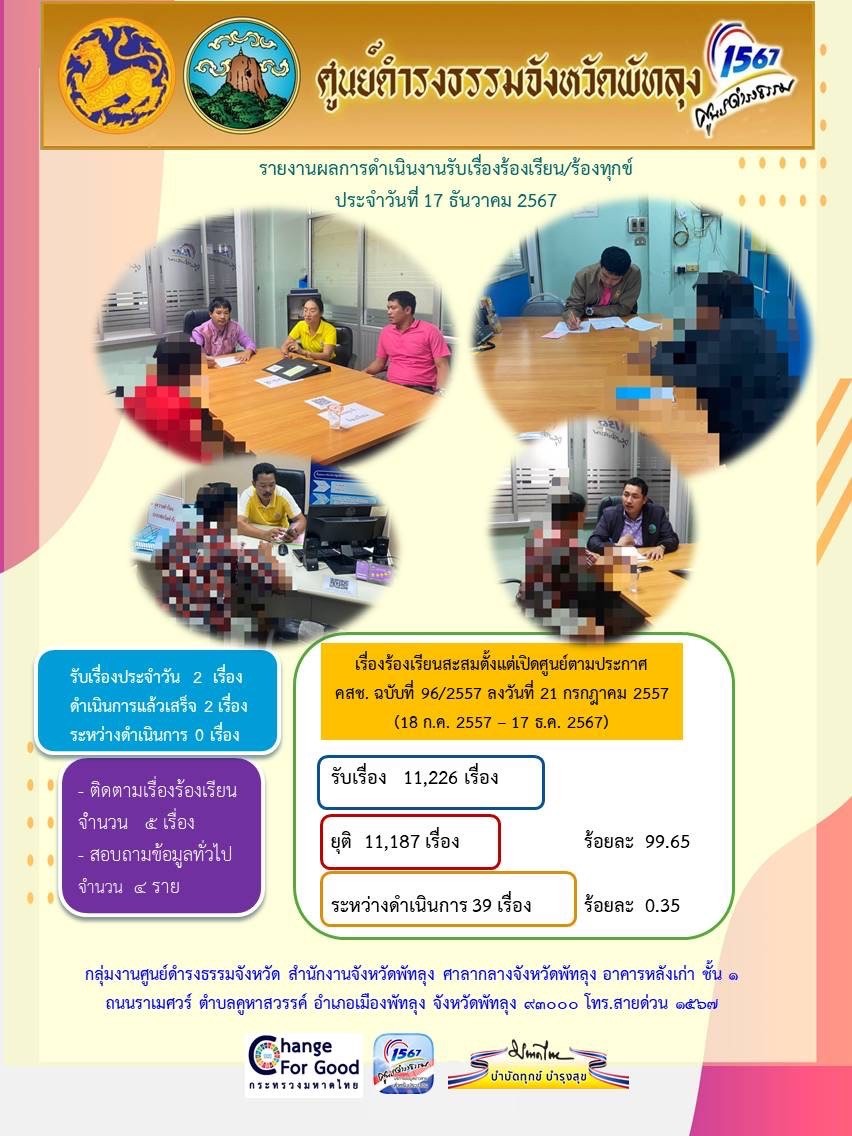 สถิติรับเรื่องร้องเรียน/ร้องทุกข์ วันที่ 17 ธันวาคม 2567