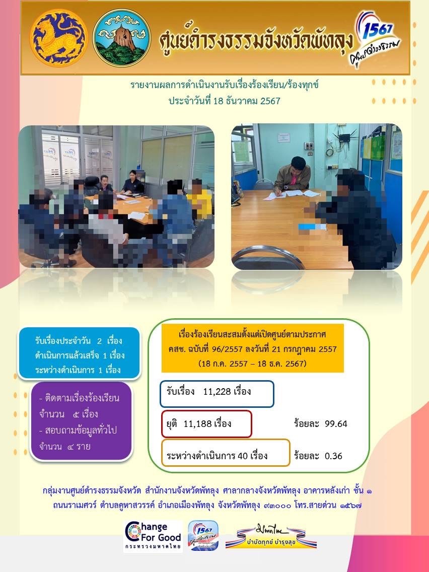 สถิติรับเรื่องร้องเรียน/ร้องทุกข์ วันที่ 18 ธันวาคม 2567
