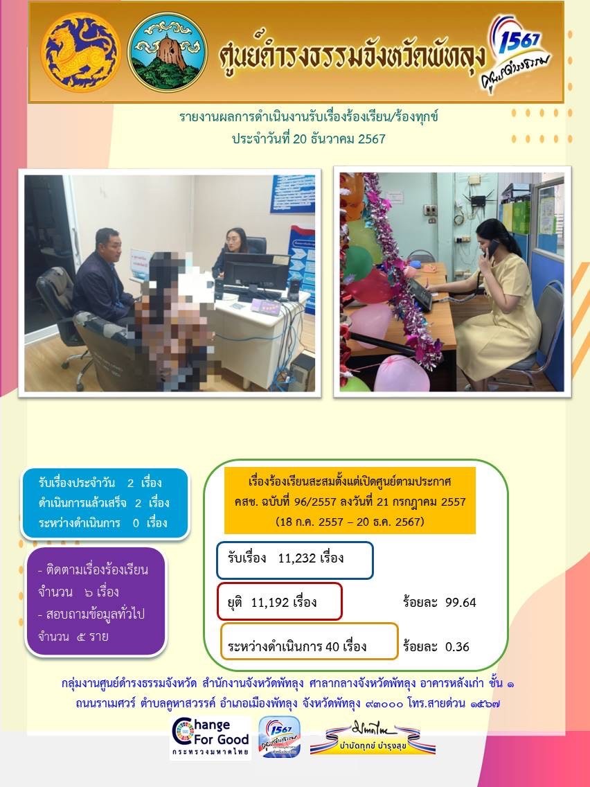 สถิติรับเรื่องร้องเรียน/ร้องทุกข์ วันที่ 20 ธันวาคม 2567