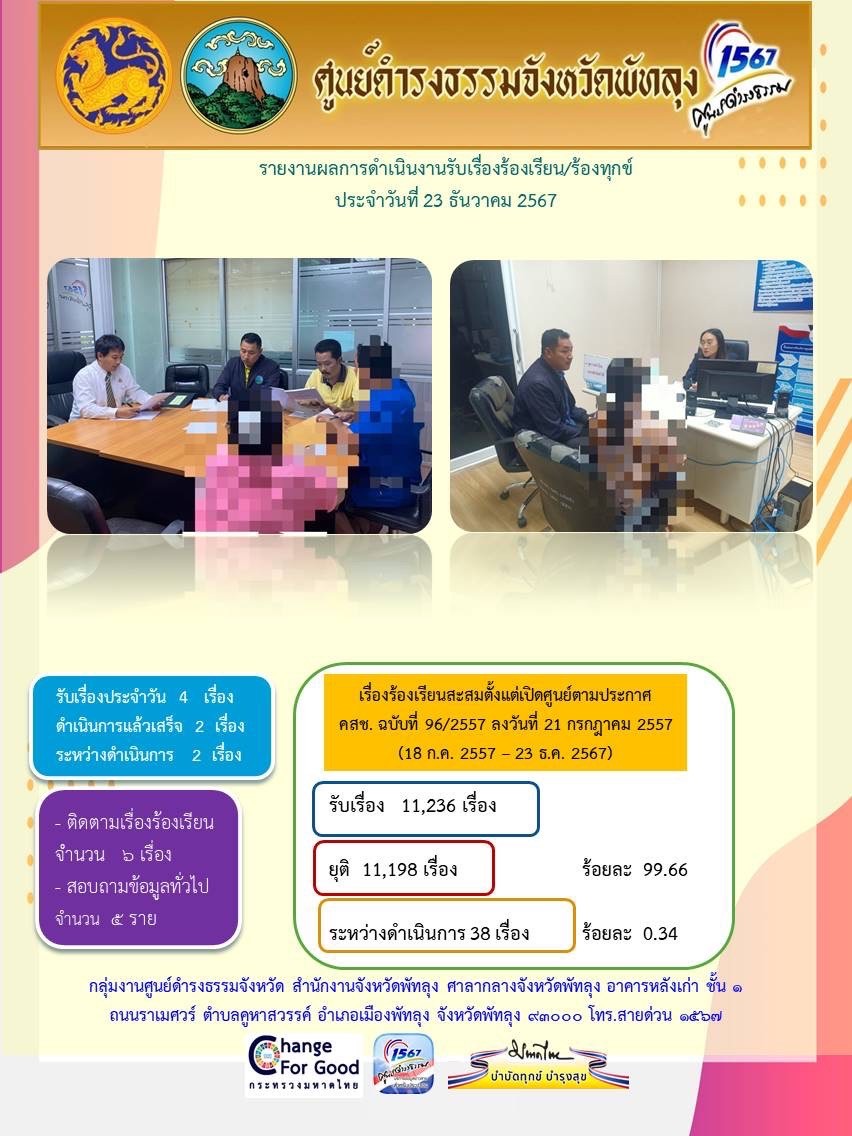 สถิติรับเรื่องร้องเรียน/ร้องทุกข์ วันที่ 23 ธันวาคม 2567