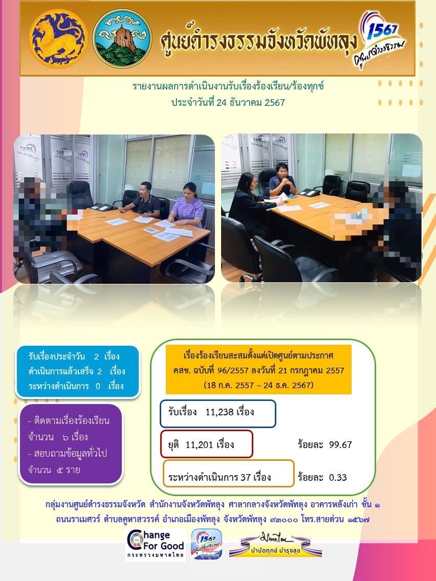 สถิติรับเรื่องร้องเรียน/ร้องทุกข์ วันที่ 24 ธันวาคม 2567