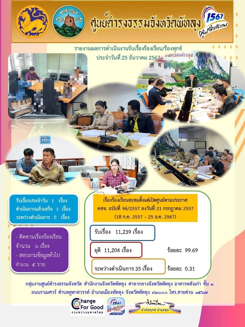 สถิติรับเรื่องร้องเรียน/ร้องทุกข์ วันที่ 25 ธันวาคม 2567