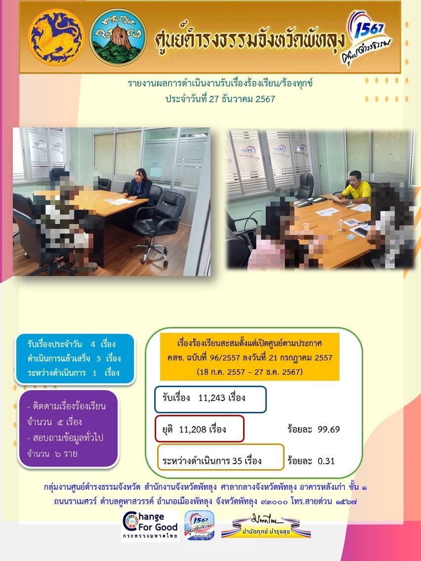 สถิติรับเรื่องร้องเรียน/ร้องทุกข์ วันที่ 27 ธันวาคม 2567