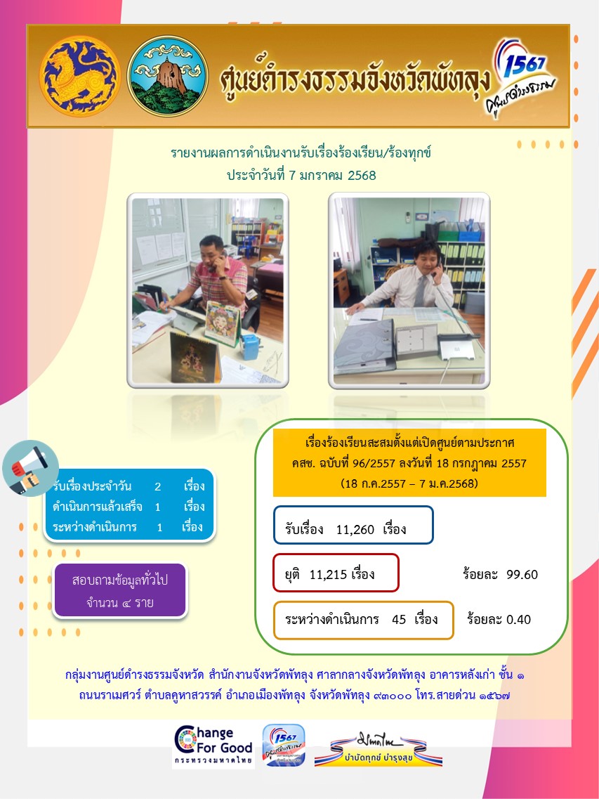 สถิติรับเรื่องร้องเรียน/ร้องทุกข์ วันที่ 7 มกราคม 2568