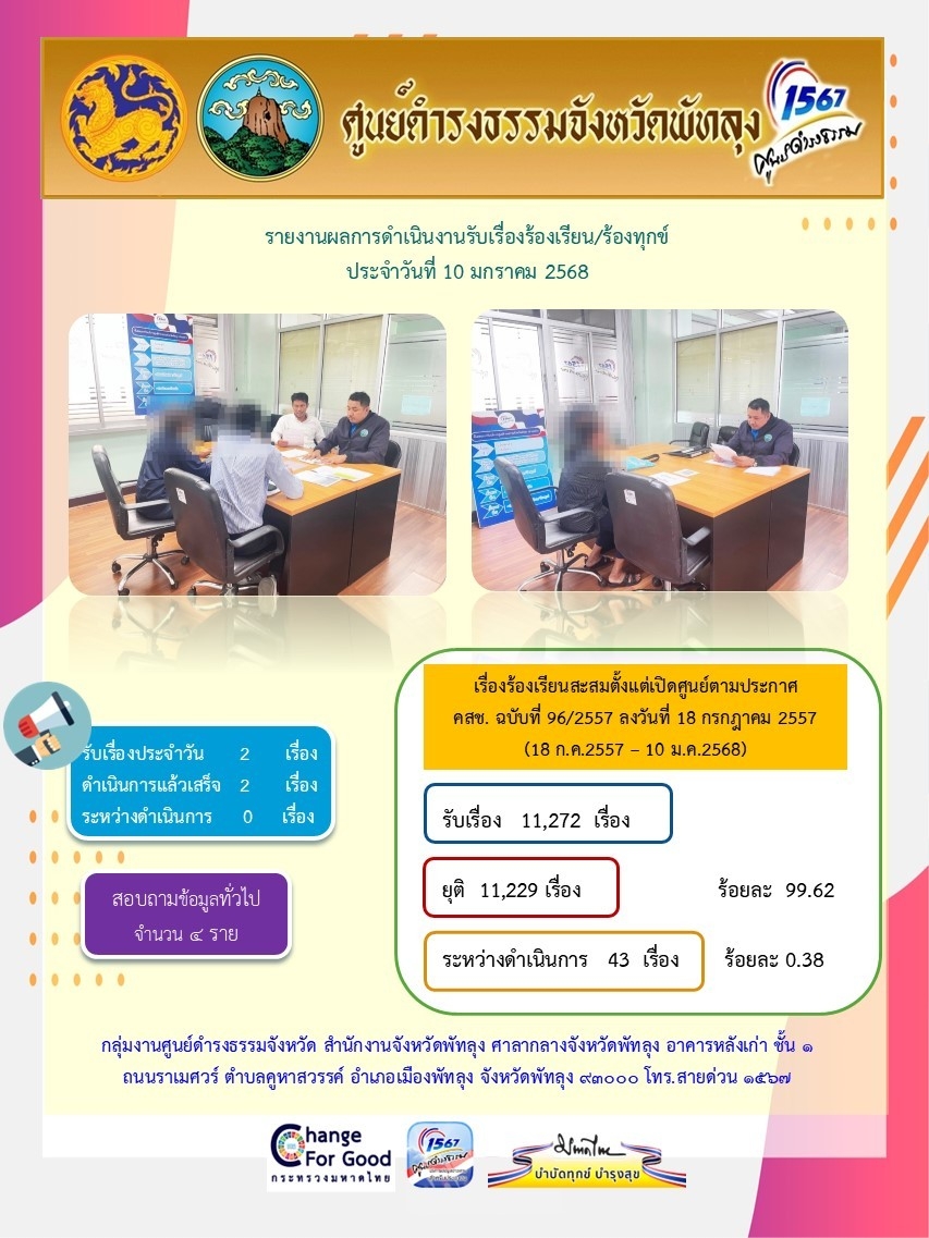 สถิติรับเรื่องร้องเรียน/ร้องทุกข์ วันที่ 10 มกราคม 2568