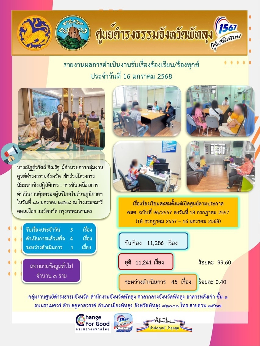 สถิติรับเรื่องร้องเรียน/ร้องทุกข์ วันที่ 16 มกราคม 2568