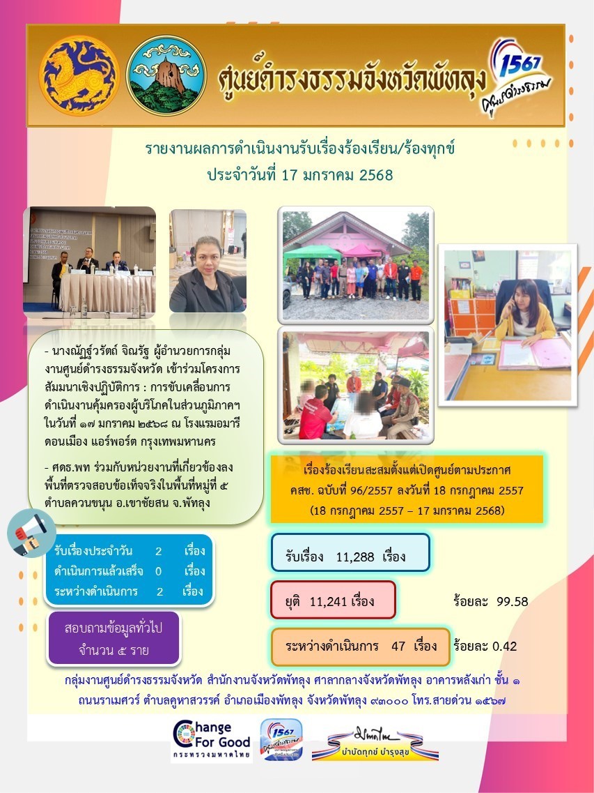 สถิติรับเรื่องร้องเรียน/ร้องทุกข์ วันที่ 17 มกราคม 2568