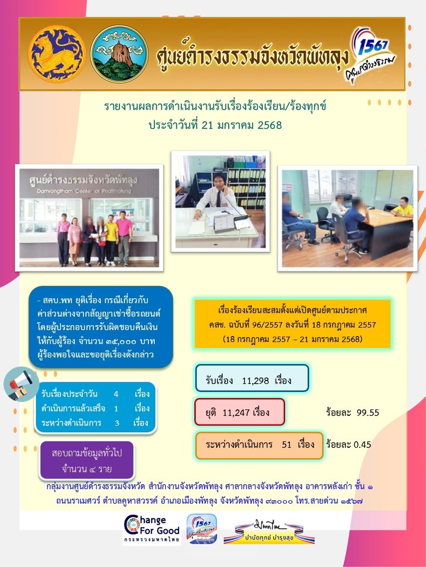 สถิติรับเรื่องร้องเรียน/ร้องทุกข์ วันที่ 21 มกราคม 2568