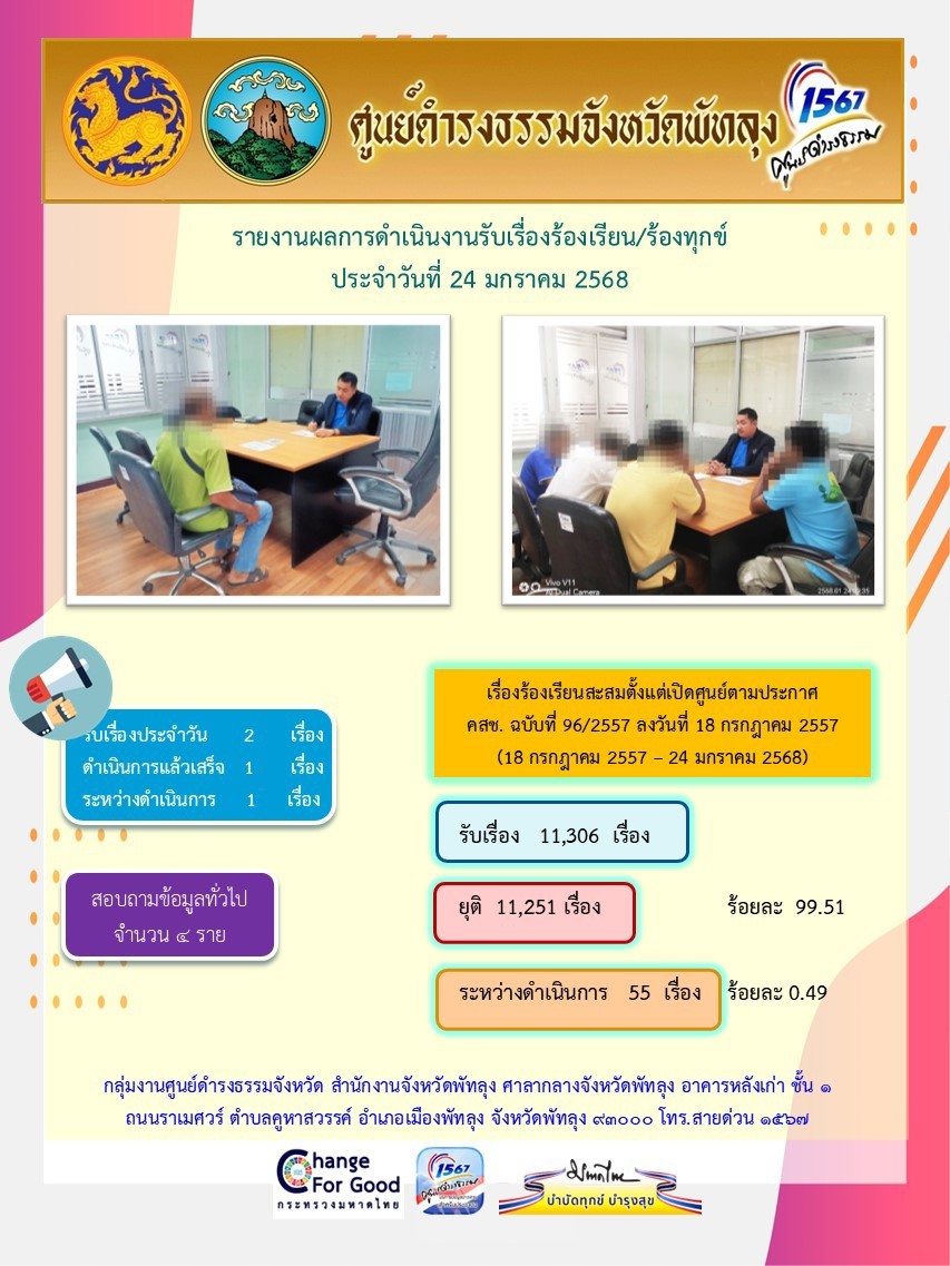 สถิติรับเรื่องร้องเรียน/ร้องทุกข์ วันที่ 24 มกราคม 2568