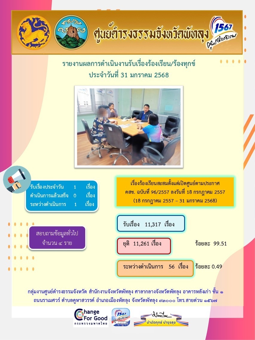 สถิติรับเรื่องร้องเรียน/ร้องทุกข์ วันที่ 31 มกราคม 2568