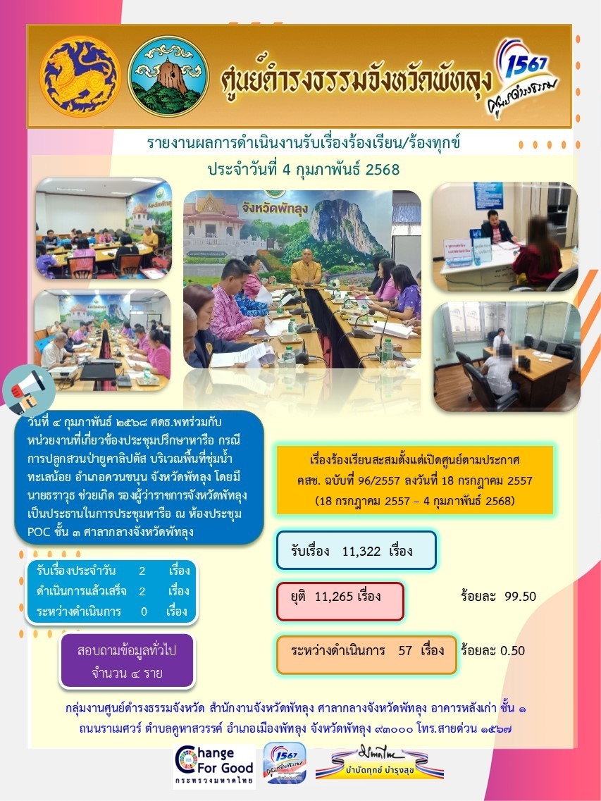 สถิติรับเรื่องร้องเรียน/ร้องทุกข์ วันที่ 4 กุมภาพันธ์ 2568