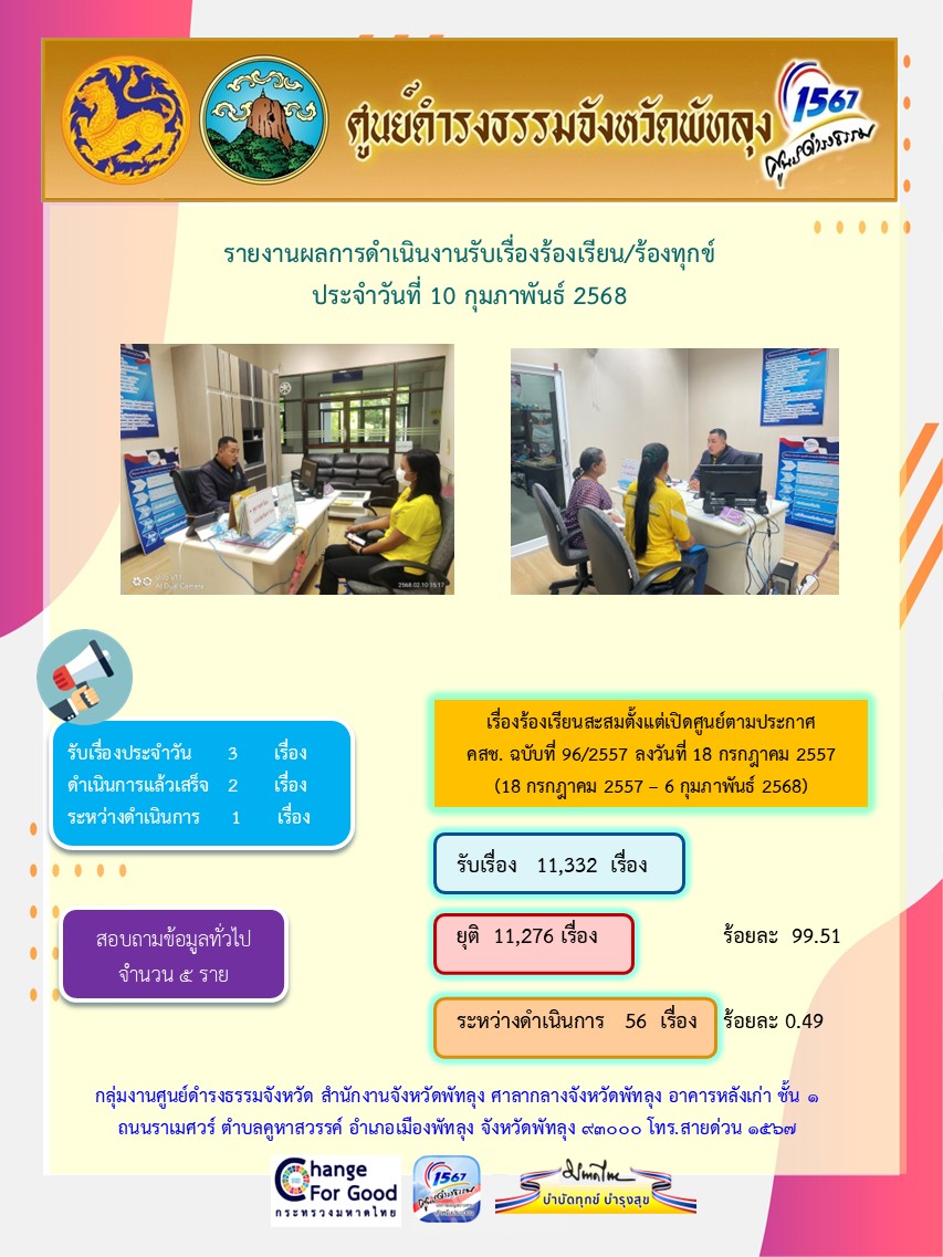 สถิติรับเรื่องร้องเรียน/ร้องทุกข์ วันที่ 10 กุมภาพันธ์ 2568