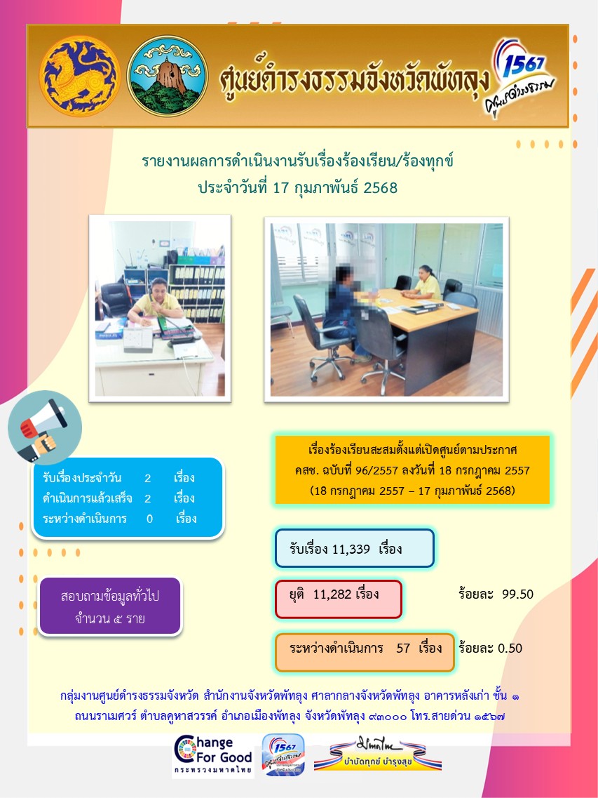 สถิติรับเรื่องร้องเรียน/ร้องทุกข์ วันที่ 17 กุมภาพันธ์ 2568