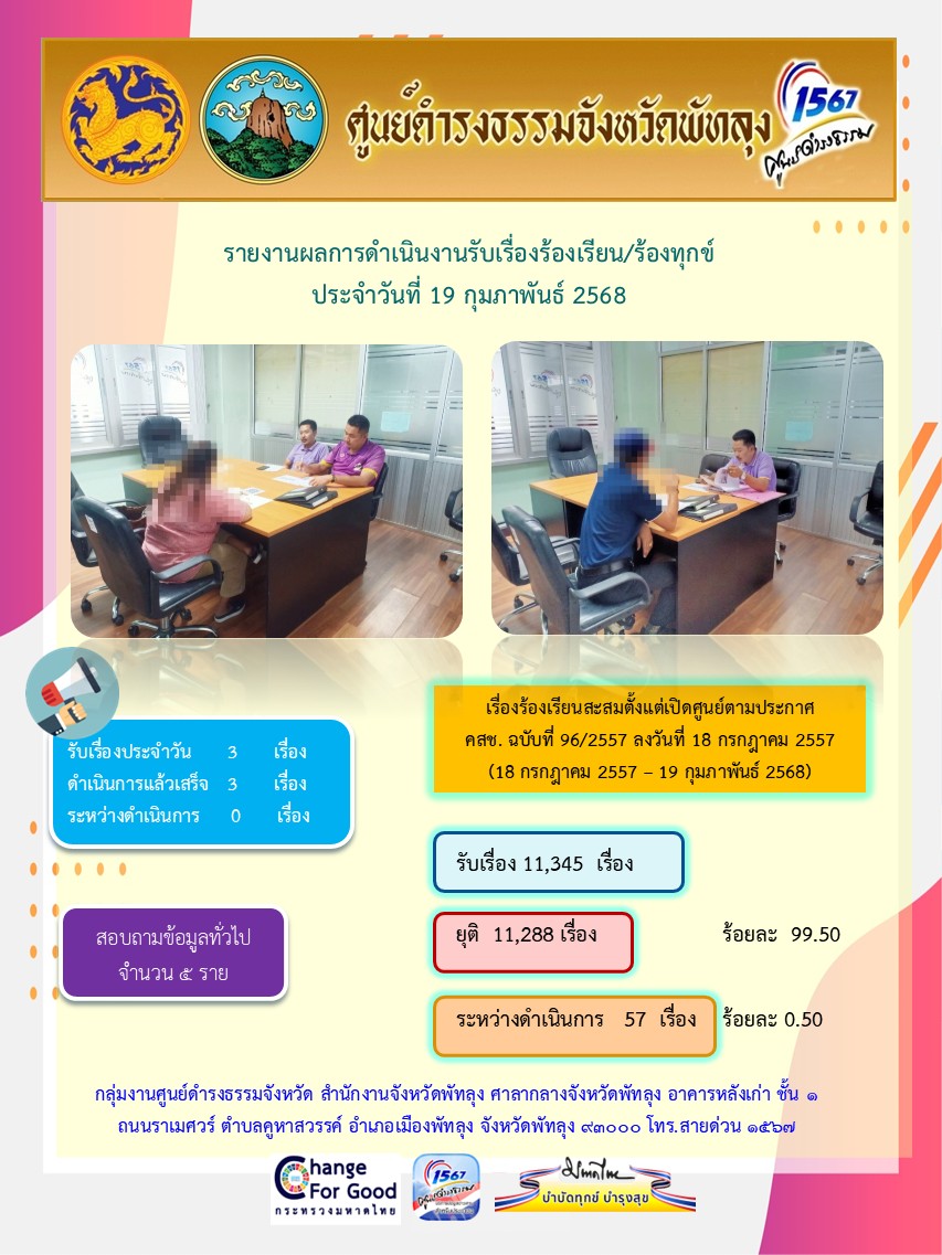 สถิติรับเรื่องร้องเรียน/ร้องทุกข์ วันที่ 19 กุมภาพันธ์ 2568