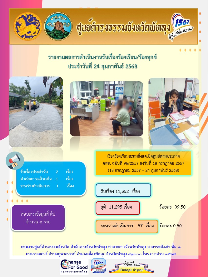 สถิติรับเรื่องร้องเรียน/ร้องทุกข์ วันที่ 24 กุมภาพันธ์ 2568