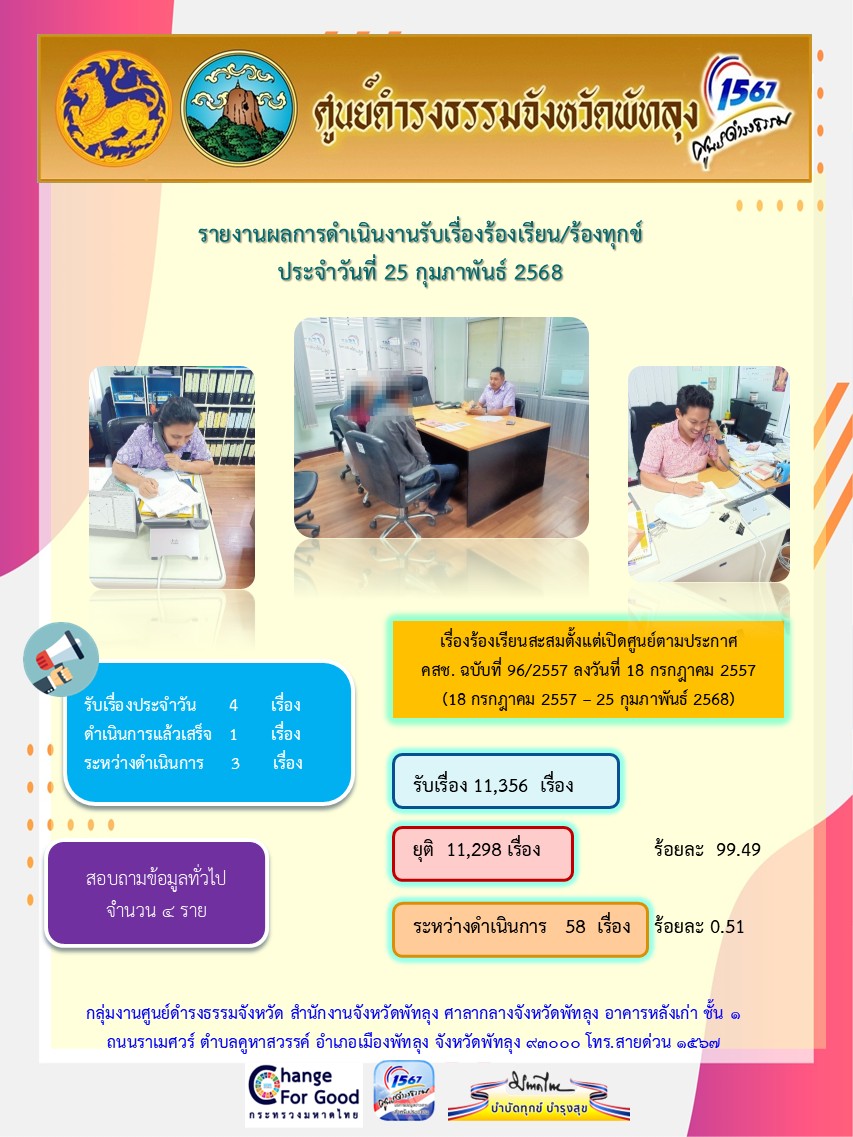 สถิติรับเรื่องร้องเรียน/ร้องทุกข์ วันที่ 25 กุมภาพันธ์ 2568