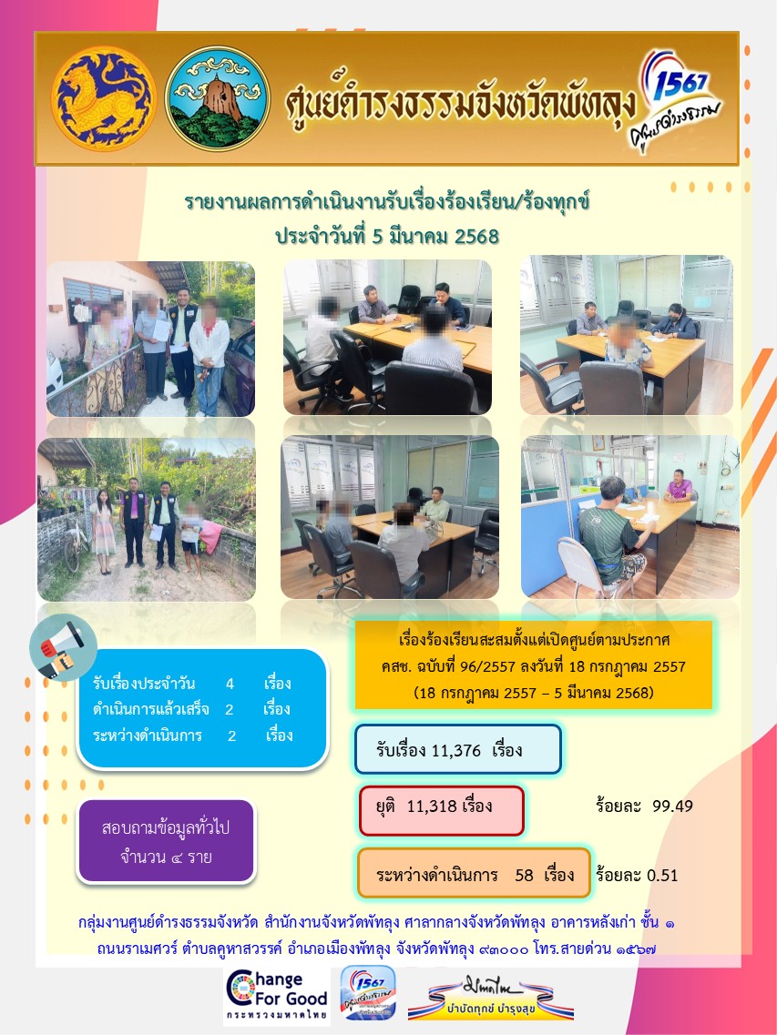 สถิติรับเรื่องร้องเรียน/ร้องทุกข์ วันที่ 5 มีนาคม 2568