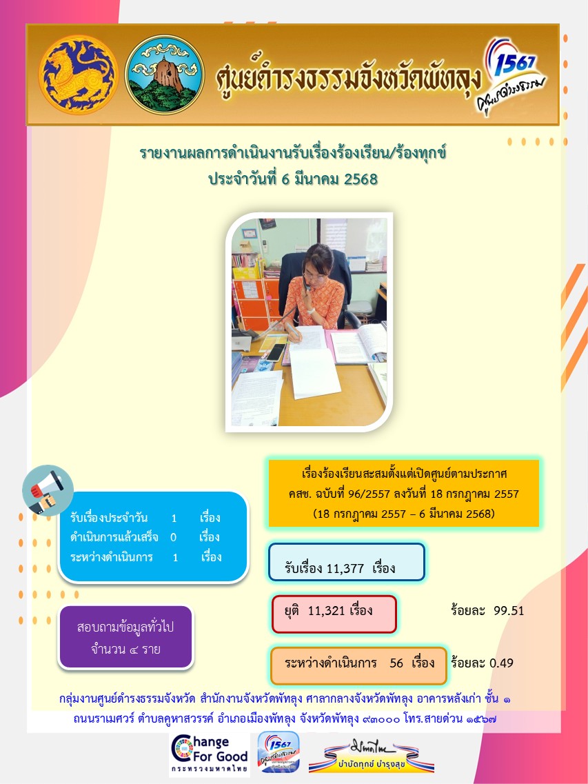 สถิติรับเรื่องร้องเรียน/ร้องทุกข์ วันที่ 6 มีนาคม 2568