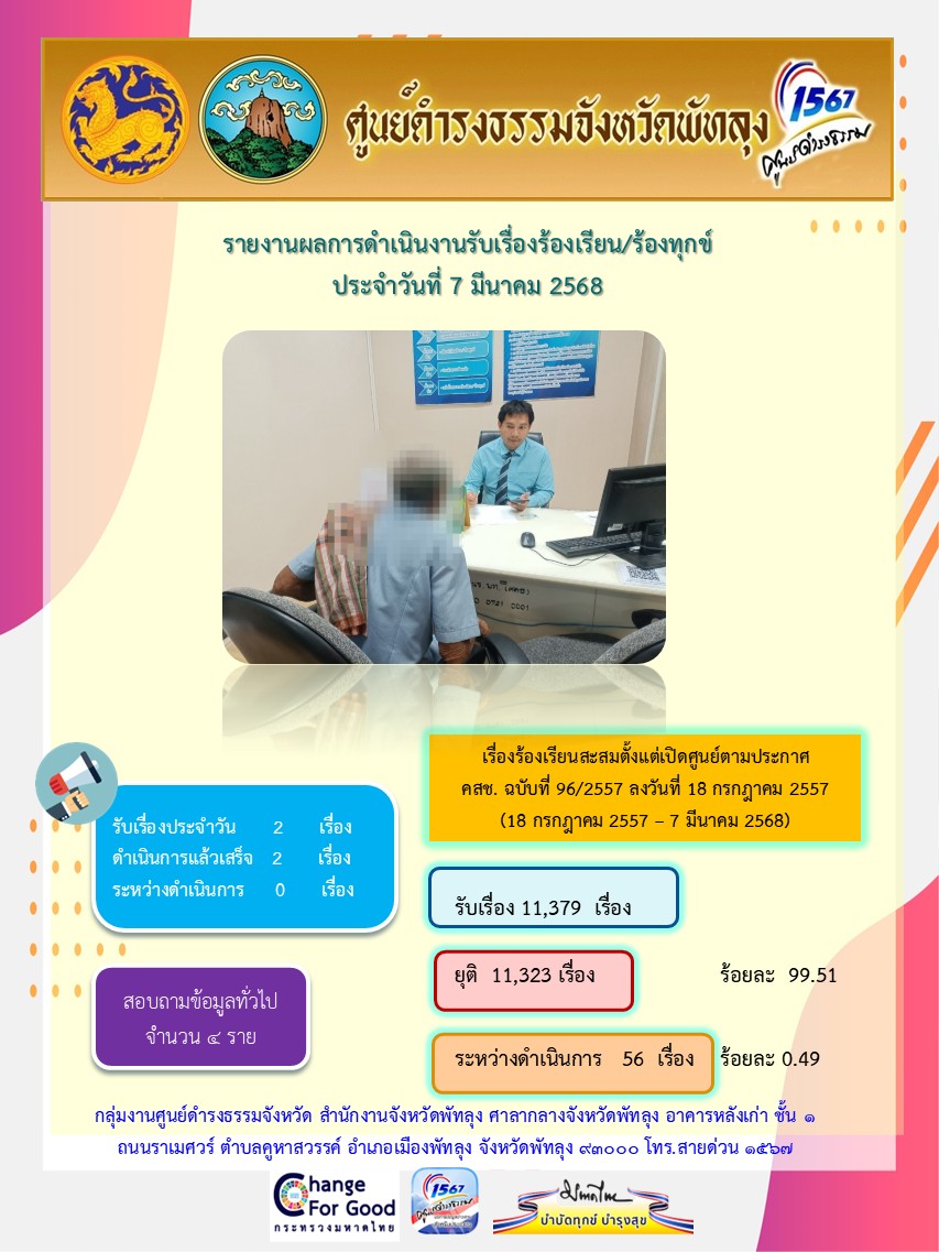 สถิติรับเรื่องร้องเรียน/ร้องทุกข์ วันที่ 7 มีนาคม 2568