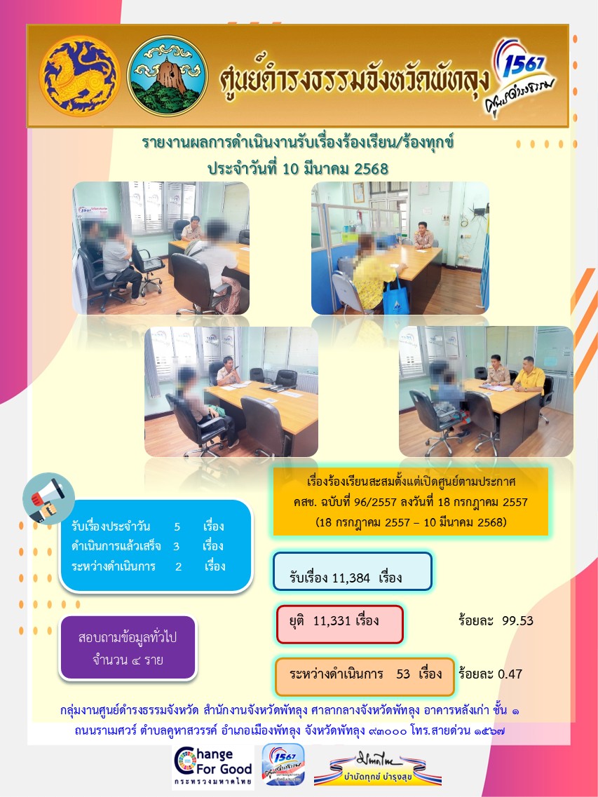 สถิติรับเรื่องร้องเรียน/ร้องทุกข์ วันที่ 10 มีนาคม 2568